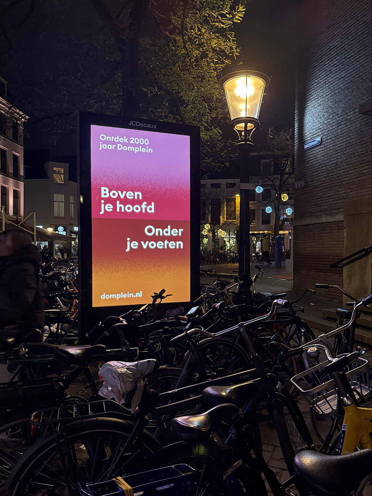 Gestapelde tijd, verborgen lagen… Dat is het verhaal achter de overkoepelende identiteit die we voor het Domplein hebben ontwikkeld. Vier bijzondere locaties – Domkerk, Domtoren, DOMunder en Paleis Lofen – trekken samen jaarlijks meer dan 650.000 bezoekers. Elk vanuit hun eigen invalshoek, maar altijd met hetzelfde doel: het ontsluiten van 2000 jaar geschiedenis, die zich precies hier, op het Domplein, heeft opgestapeld.